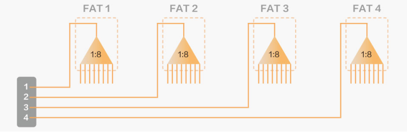 如果居民密度一般,通常選用8端口FAT,如果用戶密度非常小,也可選用4端口或2端口FAT。FAT至住戶平均接入距離通常在30~80米。