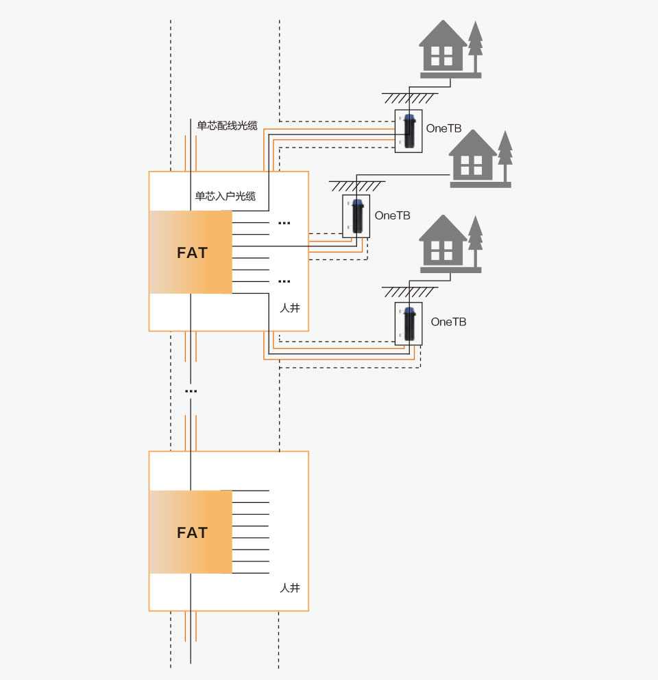 圖12中FAT為第二級(jí)分光器,建議安裝在人井的壁上,可根據(jù)住戶的密集程度選用8端口FAT或4端口FAT,F(xiàn)AT至用戶住址采用預(yù)連接方式,在用戶門(mén)口(墻外)布放OneTB(地平面之下)。FAT至OneTB采用預(yù)連接光纜可與配線段光纜同溝縱向布放,此段預(yù)連接光纜可外加一層保護(hù)管,到用戶門(mén)口位置再橫向挖溝,與OneTB相連。